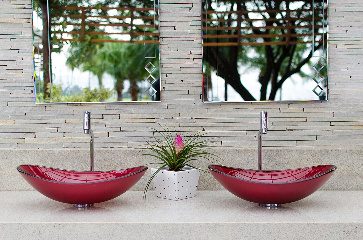 Também para banheiros, a Astra possui diversos modelos de cubas de pia feitas em vidro temperado curvado.