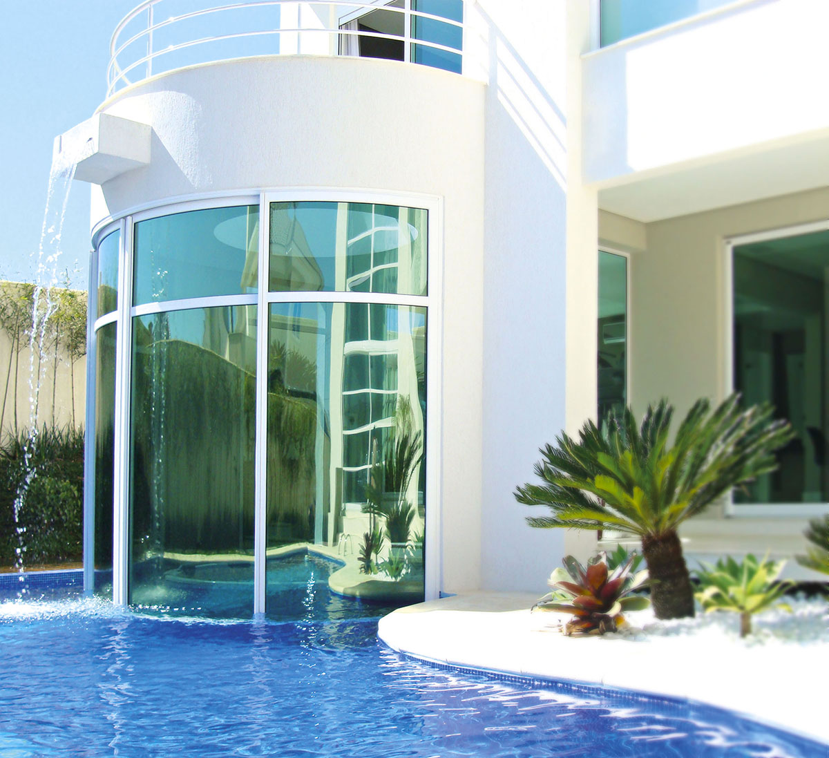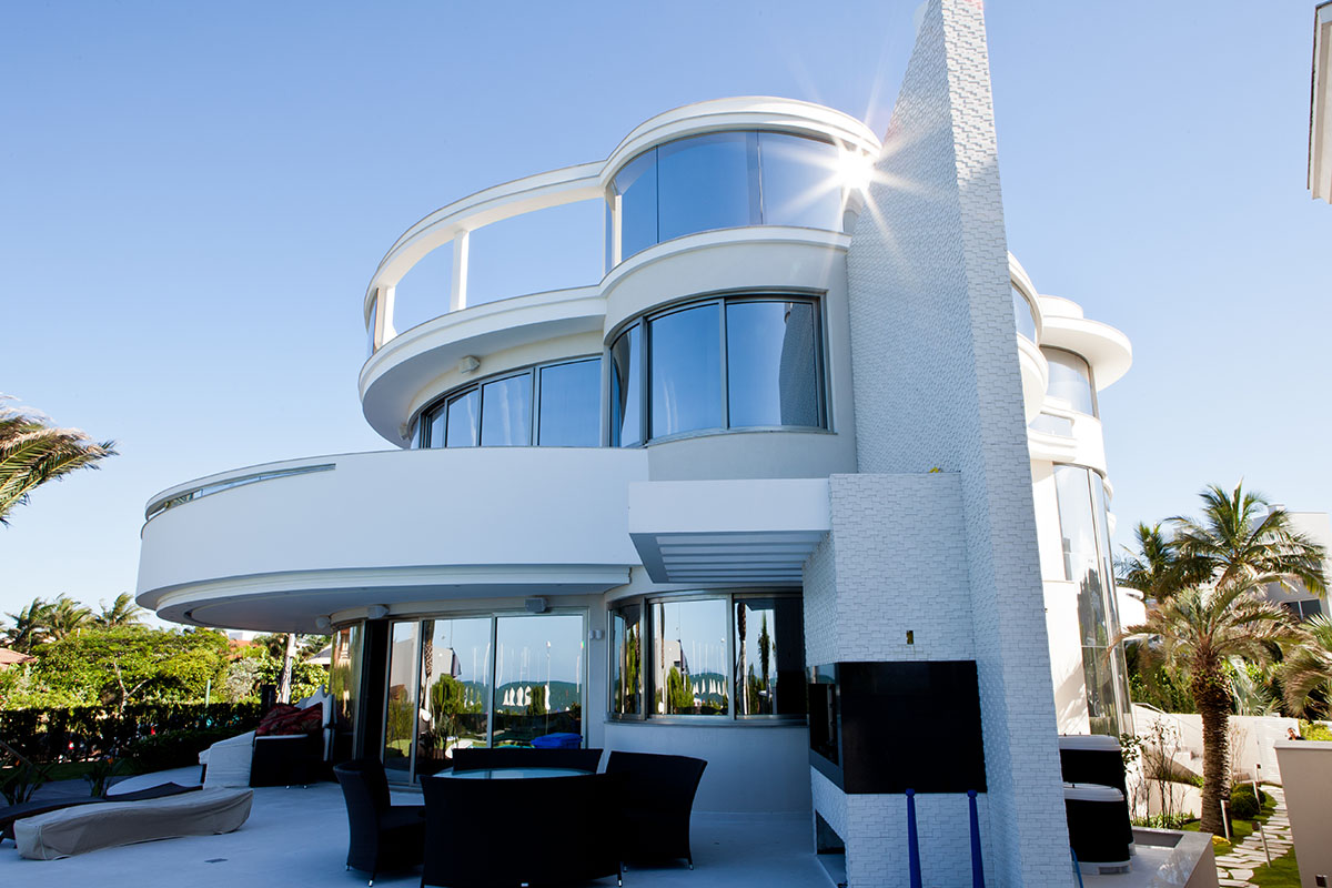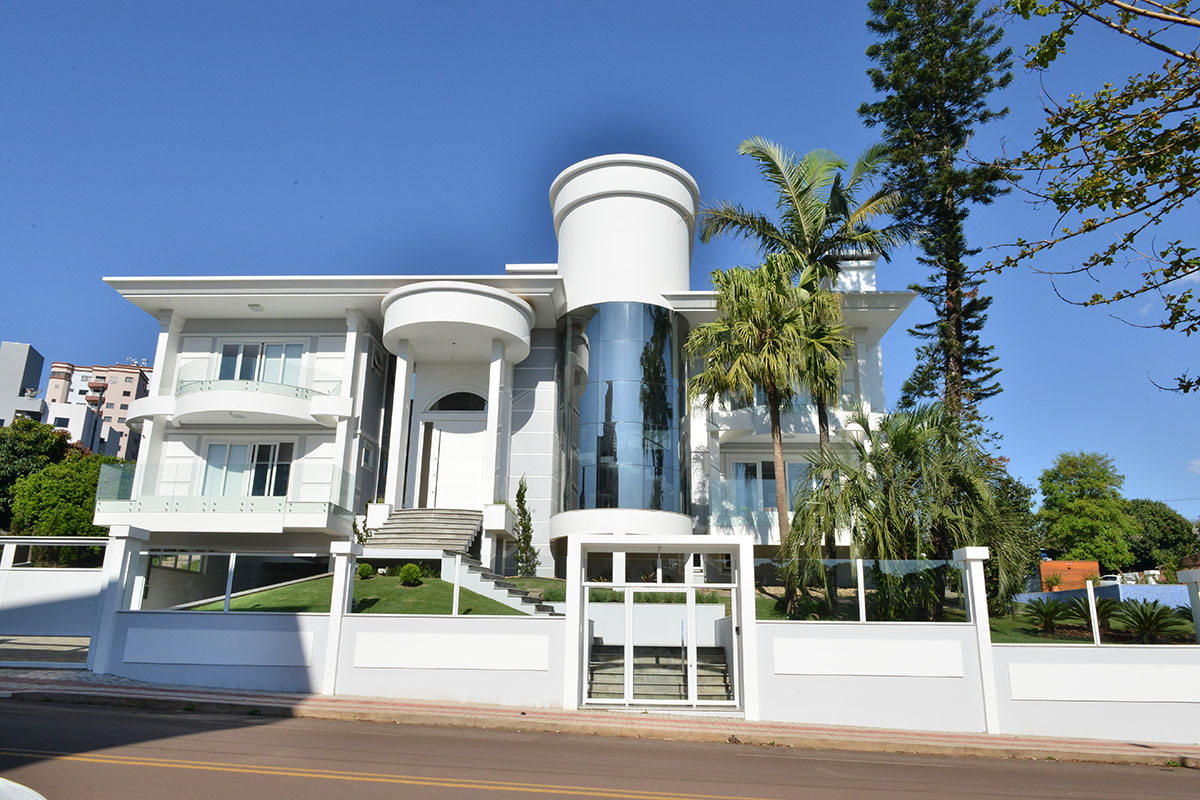 Localizada em Pinhalzinho – SC, a casa de 1000m² ocupa um lote de esquina de mais de 2000m² dentro da área urbana. A fachada principal ganhou maior destaque através da escada helicoidal que fica envolvida por elemento com vidros laminados curvos. Assim também foram trabalhadas as sacadas, que com a curva harmonizaram o restante da obra. O efeito estético não teria sido o mesmo se não fossem utilizados estes vidros curvos. O vidro é laminado curvo foi trabalhado como guarda corpo nas sacadas com uma composição de dois vidros de 6mm de espessura e uma lâmina incolor.