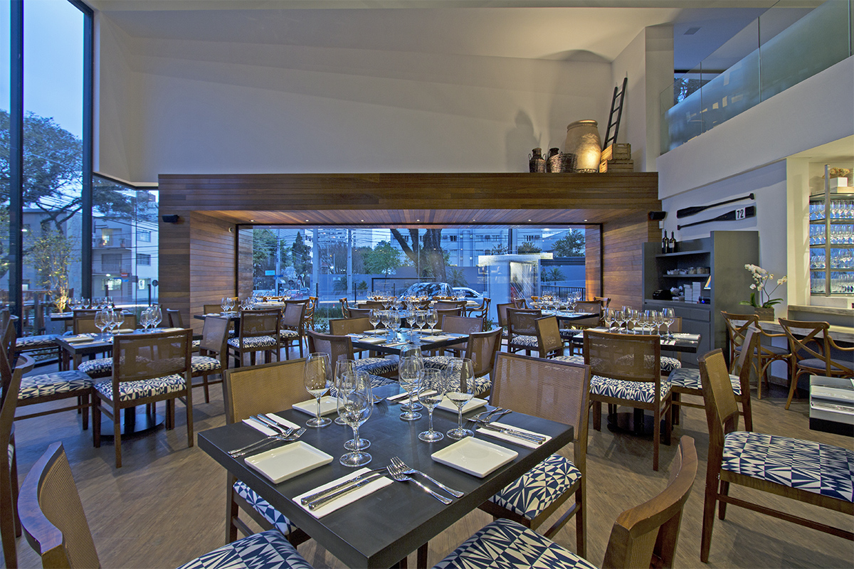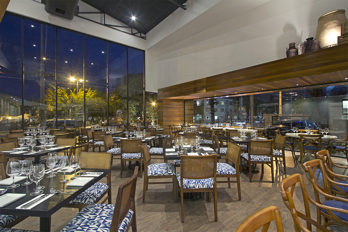 “O apelo do uso do vidro foi pelo bem estar dos clientes, para que eles pudessem apreciar a movimentação nas ruas e da praça, muito frequentada nos fins de tarde, devido ao grande número de bares e restaurantes. Logo, a vantagem comercial acabou sendo consequência. O restaurante se transforma em uma grande vitrine à noite”, define. O vidro escolhido para essa obra foi o laminado 5+5 incolor. Foram utilizadas esquadrias de alumínio com pintura eletroestática na cor preta, perfil contínuo piso/teto e fixação por silicone estrutural. Os vidros são da Cebrace. Já as ferragens e acessórios foram fornecidos pela Alumisistem.