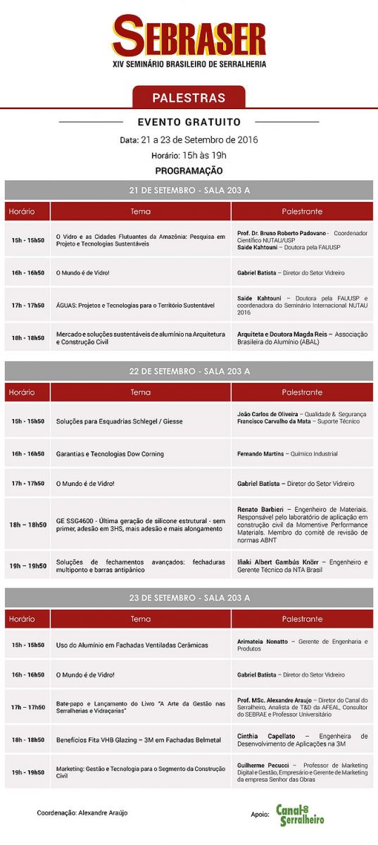 As palestras ocorrem dos dias 21 a 23, das 15h às 19h. A entrada é gratuita. Confira a programação geral de palestras da Sebraser.